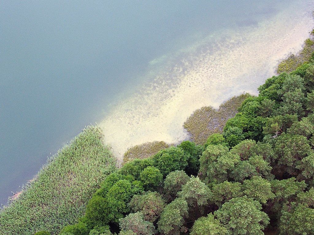 Same brzegi akwenu wolne są od wodorostów, miejscami porasta je jedynie pasmo trzcin.
